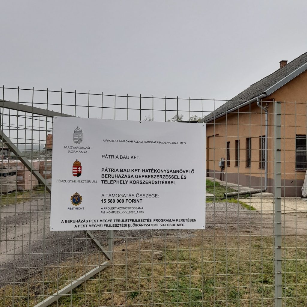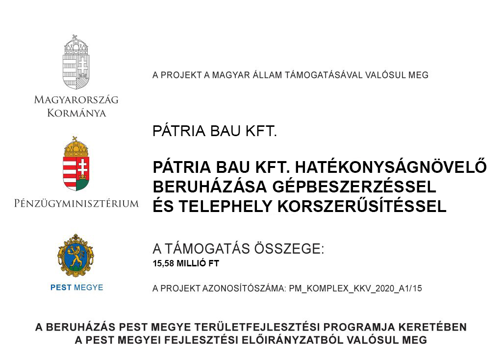 • A projekt címe: Pátria Bau Kft. hatékonyságnövelő beruházása gépbeszerzéssel és telephely korszerűsítéssel